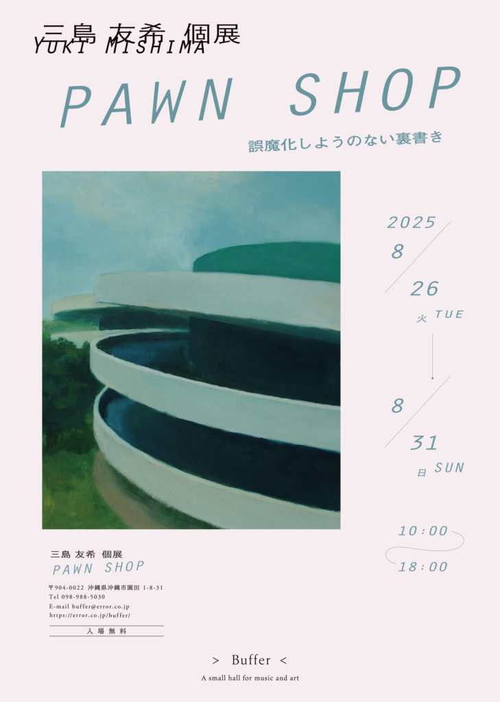 Arts for Education tambourine 主宰であり、美術家の三島友希が、沖縄市園田のギャラリースペース「Buffer」にて個展『PAWN SHOP』を開催。本展は6年ぶりの個展、そして絵画作品に絞り臨んだ展覧会として一般公開されます。会期中入場無料。